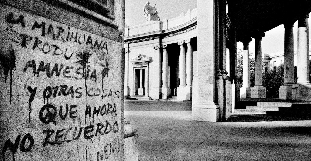 A pocos metros de este lúcido argumento sobre la marihuana, en la base de una columna,