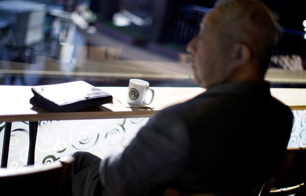 la taza de café ya consumido y, como fondo, tras la barrera de cristal, la calle. Su conjunto,